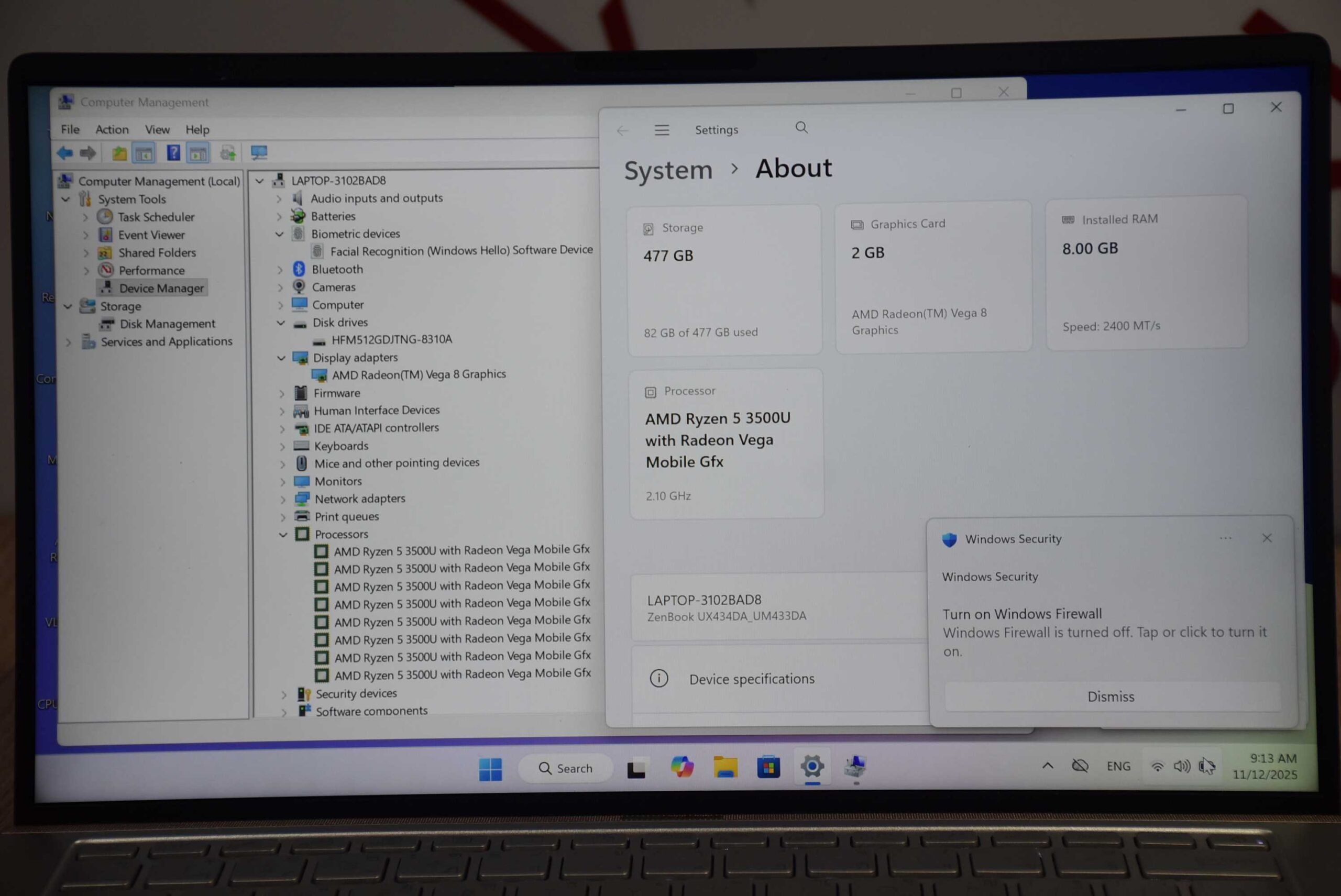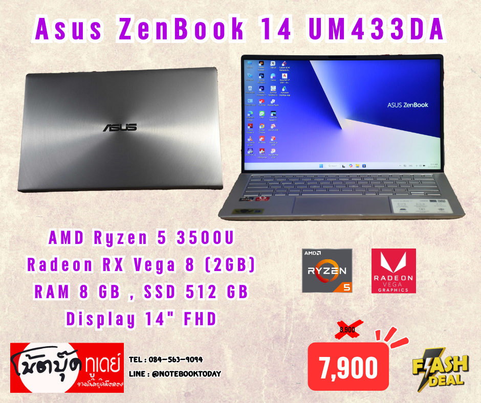 โน๊ตบุ๊คเครื่องไม่ใหญ่พกพาได้ กับรุ่น Asus ZenBook 14 UM433DA มาพร้อมกับสเปค CPU AMD Ryzen 5 3500U (2.10 GHz up to 3.70 GHz) 4คลอ 8เธรต RAM 8 GB ความจุเครื่อง SSD 512 GB มีการ์ดจอ AMD Radeon RX Vega 8 (2GB) ขนาดหน้าจอ 14 นิ้ว HD แป้นพิมไฟสีขาว ดูหนัง ฟังเพลงได้เพลินๆเลย งานออฟฟิส พิมงานทั่วไป เวิด เอ็กเซล หรือ สายกราฟิคเบาๆ ตัดต่อรูปภาพ เขียนแบบ CAD SketUp ก็ทำได้ ตัดคลิปตัดวิดิ แคนวา แคปคัต หรือจะเป็นเล่นเกมเบาๆ เกมออนไลน์ โรบ๊อก มายคราฟ นีดฟอสปีด และอื่นๆ วินโดว์11โฮมแท้ฝังเครื่องสามารถกดรีตั้งค่าใหม่โรงงานได้ครับ