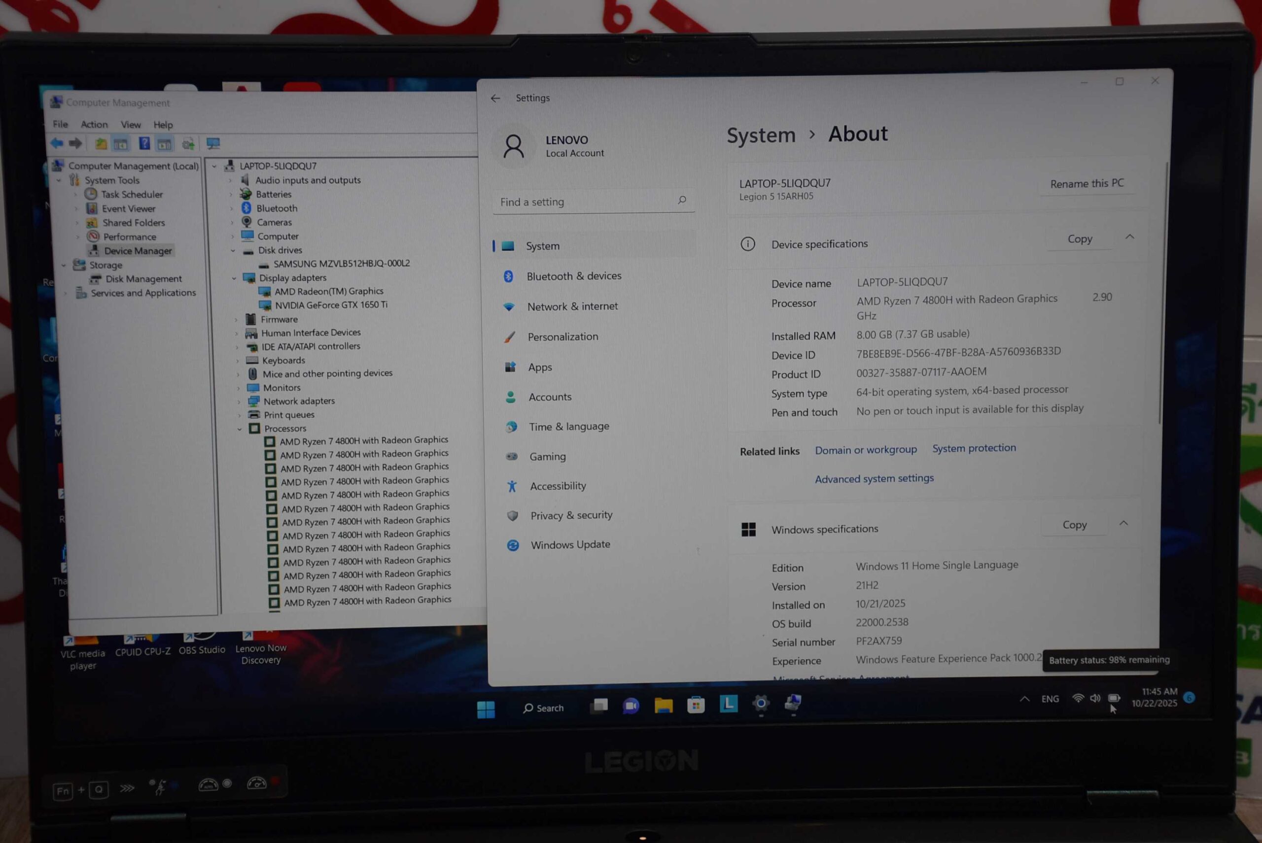 Gaming Notebook สเปคดีการ์ดจอแรง กับรุ่น Lenovo Legion 5 15ARH05 มาพร้อมสเปค CPU AMD Ryzen 7 4800H (2.90 GHz up to 4.20 GHz) 8คลอ 16เธรต แป้นพิมมีไฟ RGB จัดเต็ม RAM 8 GB DDR4 อัพเพิ่มได้อีกช่อง ความจุในตัวเครื่อง SSD 512 GB เปิดปิดเครื่อง เปิดรันโปรแกรมได้รวดเร็วทันใจเลย จอ 15.6 นิ้ว FHD 144Hz มีแป้นตัวเลขพร้อมใช้งาน การ์ดจอแยก NVIDIA GTX 1650Ti (4GB GDDR6) เล่นเกมได้ วาโร ฟีฟ่า แร๊คนาร๊อค โรลบ๊อก มายคราฟ สตรีมเกมได้ หรือจะเป็นงานกราฟฟิค ตัดรูป ตัดคลิป ตัดต่อวิดิโอ ทำงานเขียนแบบ Cad SketUp capcut Canva ก็ทำได้สบายๆ วินโดว์11โฮมแท้ฝังเครื่องสามรถกดรีตั้งค่าใหม่โรงงานได้